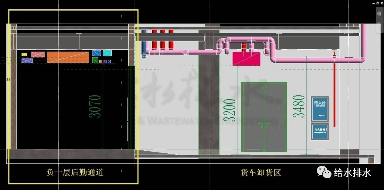 為滿足甲方對凈高的超常規(guī)要求,后勤通道中段給排水專業(yè)消防管線需要更改走向,一部分從負(fù)一層隱蔽的地方設(shè)豎管上負(fù)一夾層,再從負(fù)一層展廳頂上的鋼結(jié)構(gòu)桁架間敷設(shè)管道作為過渡,再找適當(dāng)位置作豎管回到負(fù)一層后勤通道;另一部分調(diào)至貨車車道及卸貨區(qū)上方。而后勤通道中段僅留必要的風(fēng)管,且風(fēng)管盡可能壓扁,強(qiáng)弱電分置于風(fēng)管兩側(cè),水專業(yè)僅留自動噴水滅火系統(tǒng)支管,最后勉強(qiáng)能滿足甲方在此區(qū)域的凈高要求。